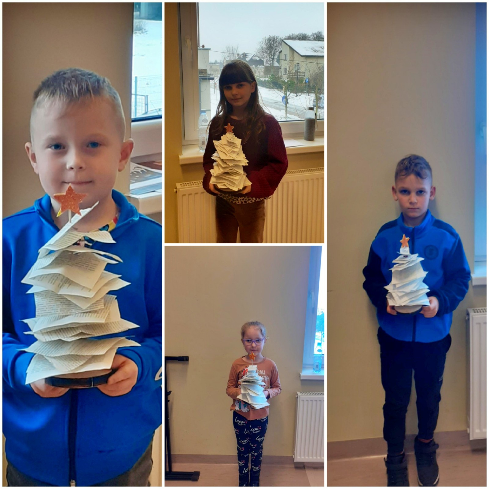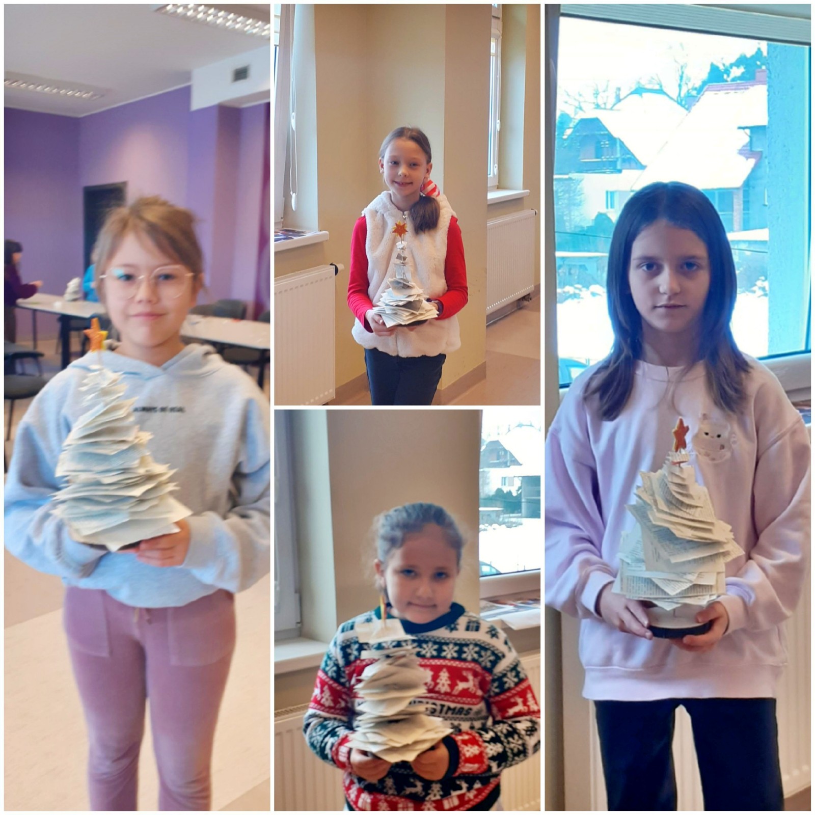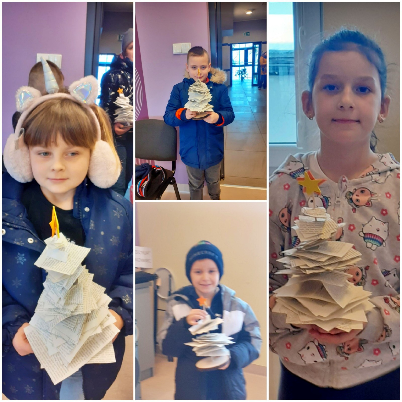 W tym roku były to nietypowe choinki. Do ich wykonania potrzebne nam były: drewniane patyczki i krążki, kartki ze starych książek, nożyczki oraz klej. Zadanie to było bardzo wymagające, lecz dzieci poradziły sobie z nim świetnie.