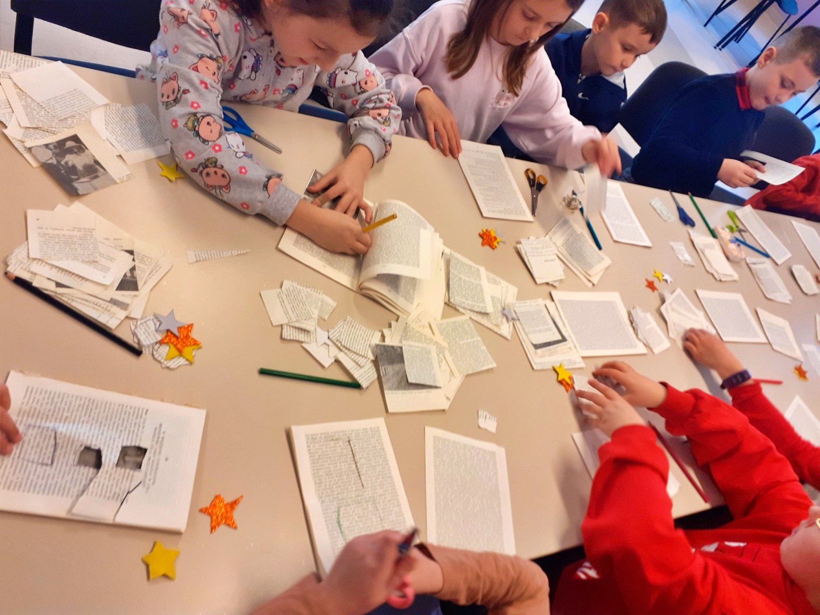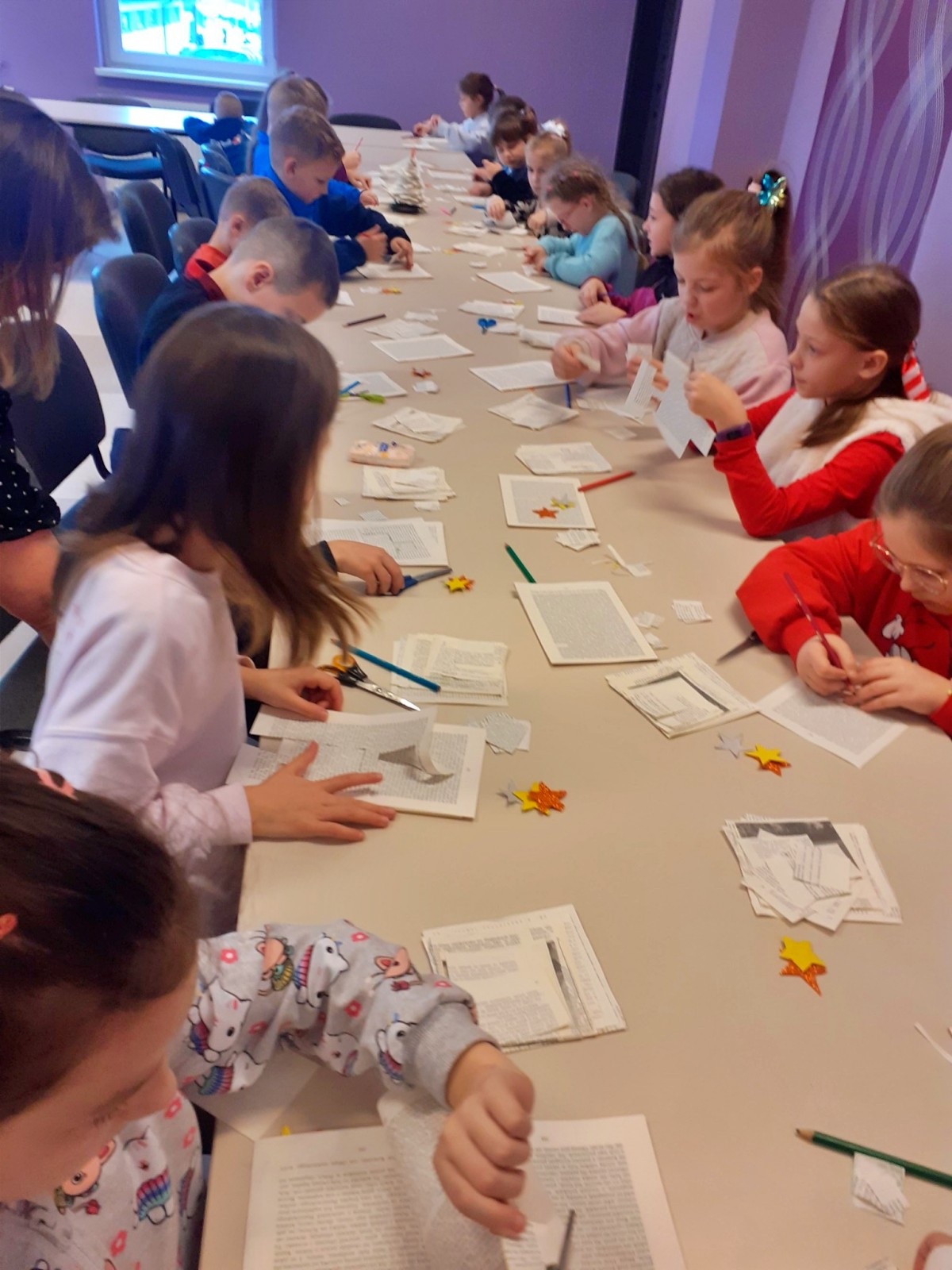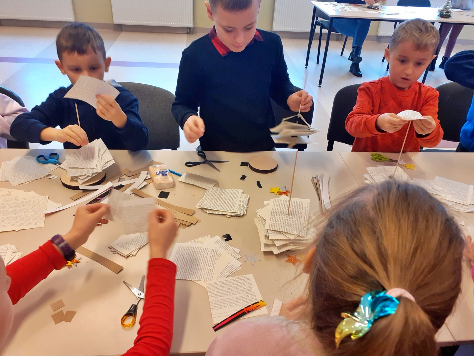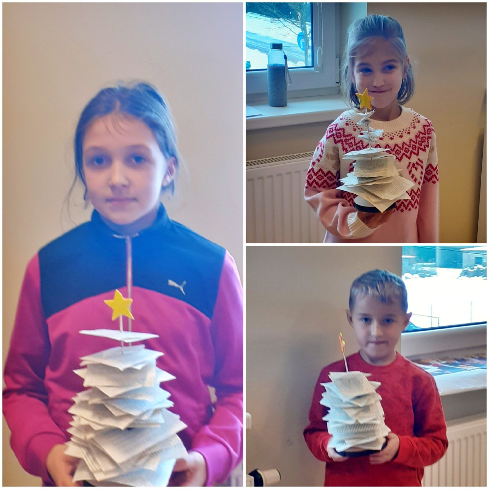 W tym roku były to nietypowe choinki. Do ich wykonania potrzebne nam były: drewniane patyczki i krążki, kartki ze starych książek, nożyczki oraz klej. Zadanie to było bardzo wymagające, lecz dzieci poradziły sobie z nim świetnie.
